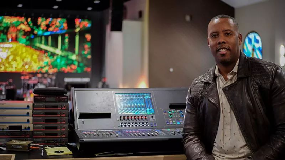 來自加州林伍德的大伊曼紐爾圣殿教堂的資深牧師 Nisan Stewart ,他身后的正是 Roland 的M-5000 現(xiàn)場混音臺。