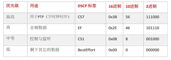 • Dante可以在網(wǎng)絡(luò)中利用DiffServ QoS進(jìn)行優(yōu)先管理,Dante將標(biāo)記數(shù)據(jù)包,并將其標(biāo)簽集成到現(xiàn)有的IT網(wǎng)絡(luò)QoS方案中。